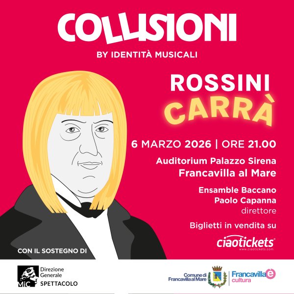 Venerdì 6 marzo ore 21.00 nell'Auditorium Palazzo Sirena di Francavilla, ascolteremo da un lato Gioachino Rossini, genio musicale capace di raccontare l’animo umano con arguzia; dall’altro Raffaella Carrà, icona pop autoironica e rivoluzionaria, simbolo di libertà e orgoglio di diversità. Collisioni è un concerto narrato che abbatte le barriere tra i generi. Protagonisti della serata saranno la cantante Brigida Carbone, il baritono Daniele Di Nunzio e l'Ensemble Baccano, diretti dal maestro e arrangiatore Paolo Capanna, con la narrazione affidata ad Alfredo Bruno.