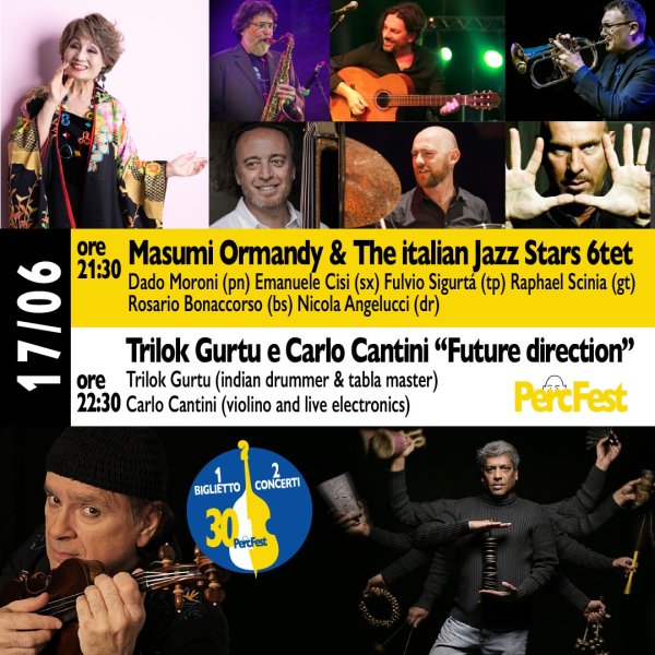 Questo concerto vede protagonista una leggenda vivente delle percussioni Trilok Gurtu, insieme al violinista e compositore Carlo Cantini, in un'esperienza sonora che abbatte i confini tra jazz, world music e musica classica contemporanea. Un ponte culturale dove il ritmo ancestrale dell'India incontra l'eleganza melodica della tradizione europea e la sperimentazione elettronica. Percussionista dallo straordinario virtuosismo e dalla classe assoluta, nel corso di tutta la sua ultra-quarantennale carriera Trilok Gurtu ha letteralmente ipnotizzato un’impressionante serie di artisti di livello mondiale, John Mc Laughlin, Joe Zawinul, Jan Garbarek, Shenkar, Bill Evans, Pharoah Sanders, Dave Holland, gli Oregon, e in Italia Ivano Fossati, Pino Daniele, Adriano Celentano, Gianna Nannini, Paolo Fresu, Stefano Bollani… tutti folgorati dalla magistrale arte del ritmo di Trilok. Fondendo tecnica occidentale e indiana, Gurtu ha sviluppato uno stile e un suono inconfondibili che da metà anni ‘90 lo rendono dominatore assoluto delle classifiche di popolarità tra i percussionisti di tutto il mondo. Carlo Cantini si muove con disinvoltura negli ambienti musicali più disparati con una dichiarata predilezione per la musica classica, il jazz, la fusion e la musica sperimentale. Ha suonato tra i tanti con: M. Rostropovic N. Magalov, Andrea Bocelli, Stevie Wonder, Astor Piazzolla, Paolo Fresu, Stefano Bollani, Jan Garbarek, Marcus Miller. Nel 2004 Carlo Cantini viene invitato da Trilok Gurtu a diventare membro stabile della Trilok Gurtu Band; due tournée mondiali lo portano ad esibirsi con successo nei migliori templi della world music: Royal Albert Hall di Londra, Queen Elizabeth Hall, Stadio Olimpia di Monaco, Parigi, Vienna, Blue Note di Milano, Manchester, Edimburgo, Zurigo, Innsbruck, Birmingham, Lione, Budapest, Amburgo, Beirut, Dubai, Oman, Qatar.