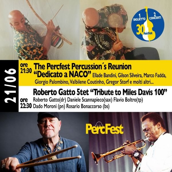 Siamo arrivati a Domenica 21 Giugno, la giornata conclusiva del Percfest 2026 e al Trentennale non poteva certo mancare un omaggio al musicista a cui il Festival stesso è dedicato, ovvero Giuseppe Bonaccorso, in arte “Naco” fratello di Rosario e grande, indimenticabile e creativo percussionista.. Nasce cosí il Percfest Percussion´s Reunion, un collettivo speciale creato per il Giubileo dei 30 anni del Percfest e dove la percussione diventa protagonista assoluta. Naco, grande maestro della percussione, giá 40 anni fa aveva saputo creare uno stile destinato ad influenzare centinaia di percussionisti contemporanei italiani e non solo. Collaboratore di importanti protagonisti della musica del tempo, come Fabrizio De André, Ivano Fossati, Lorenzo Jovanotti, Mina e decine di altri artisti della musica di qualitá, Naco ha lasciato su innumerevoli dischi le tracce indelebili del suo genio creativo. Per l´occasione l´ensemble sará formato dai grandi percussionisti, batteristi e altri strumentisti presenti al Percfest 2026 e che da tanti anni durante i seminari pomeridiani dirigono i seminari e raccontano tante storie di musica… “in musica”, leggi Ellade bandini, Gilson Silveira, Giorgio Palombino, Valbilene Coutinho, Marco Fadda, Gregor Storf e tanti, tanti altri che scoprirete sul palco.